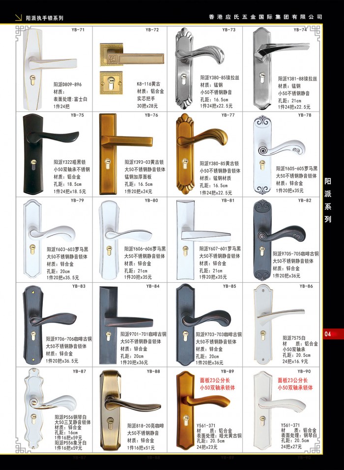 详细信息 阳派执手锁系列-04-应氏五金 简介本页是香港应氏五金国际集团有限公司2020年最新彩页 阳派执手锁系列(第四页) 图片为高清晰图片,请稍等。。。 ![]() |