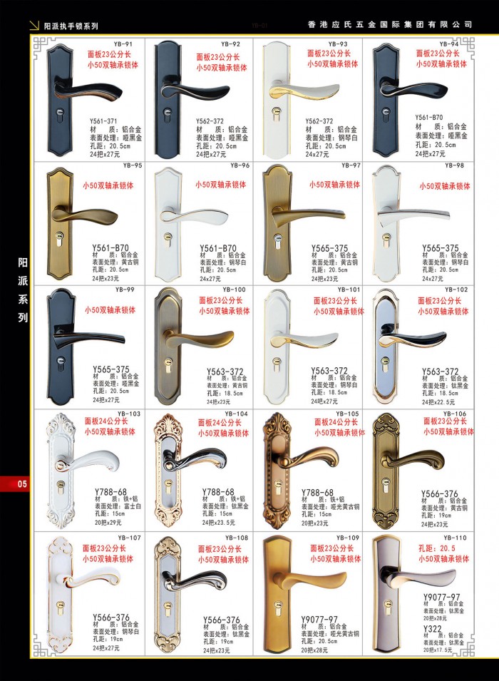 详细信息 阳派执手锁系列-05-应氏五金 简介本页是香港应氏五金国际集团有限公司2020年最新彩页 阳派执手锁系列(第五页) 图片为高清晰图片,请稍等。。。 ![]() |