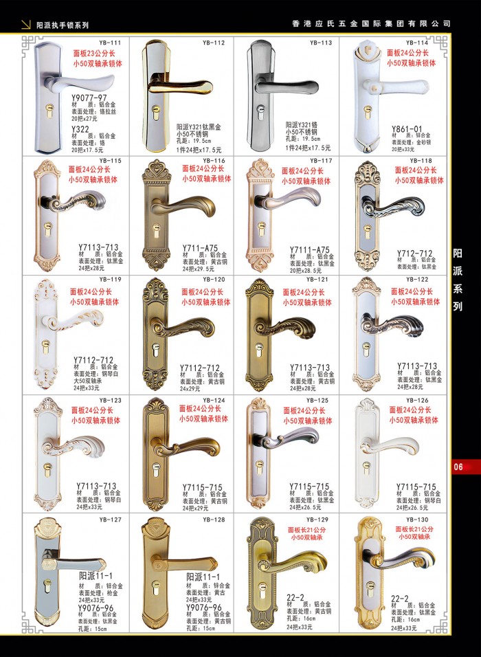 详细信息 阳派执手锁系列-06-应氏五金 简介本页是香港应氏五金国际集团有限公司2020年最新彩页 阳派执手锁系列(第六页) 图片为高清晰图片,请稍等。。。 ![]() |