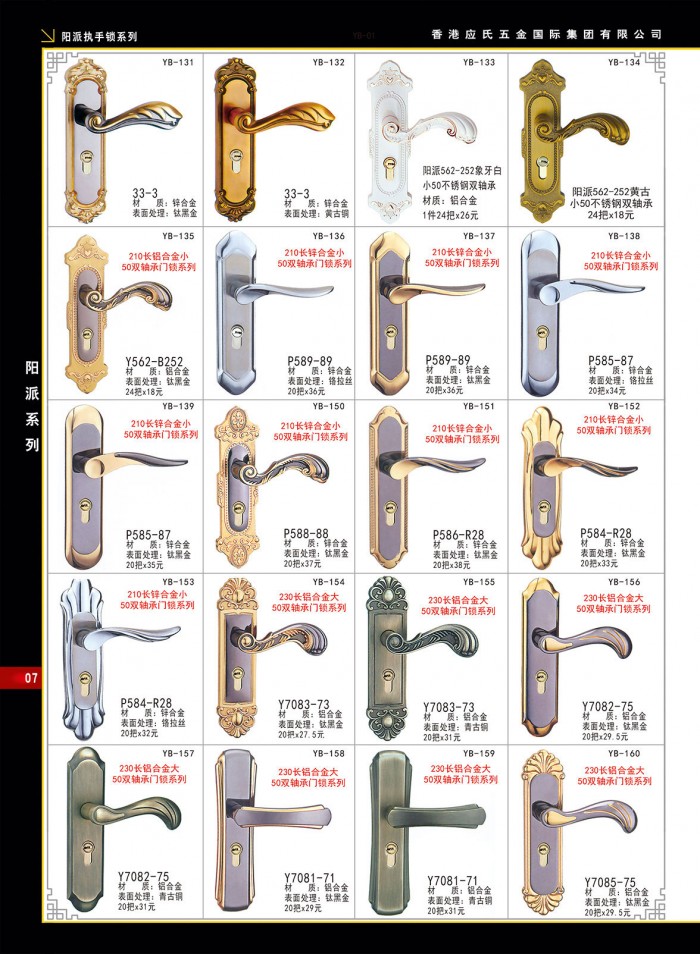 详细信息 阳派执手锁系列-07-应氏五金 简介本页是香港应氏五金国际集团有限公司2020年最新彩页 阳派执手锁系列(第七页) 图片为高清晰图片,请稍等。。。 ![]() |