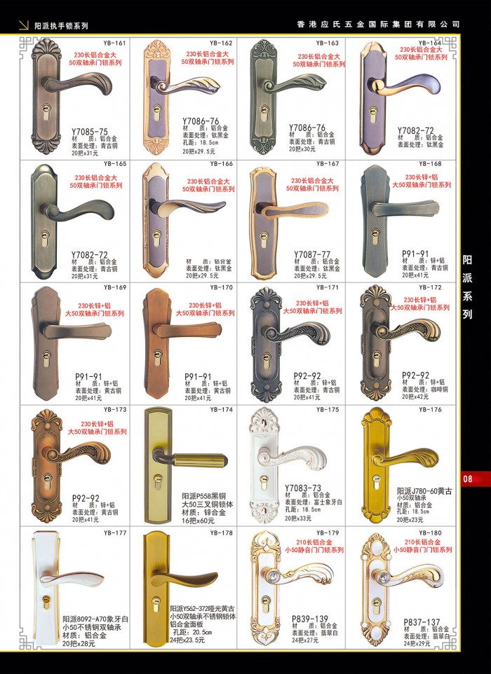 详细信息 阳派执手锁系列-08-应氏五金 简介本页是香港应氏五金国际集团有限公司2020年最新彩页 阳派执手锁系列(第八页) 图片为高清晰图片,请稍等。。。 ![]() |