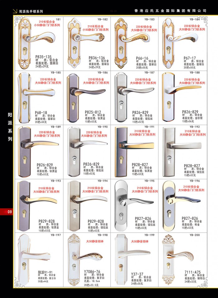 详细信息 阳派执手锁系列-09-应氏五金 简介本页是香港应氏五金国际集团有限公司2020年最新彩页 阳派执手锁系列(第九页) 图片为高清晰图片,请稍等。。。 ![]() |