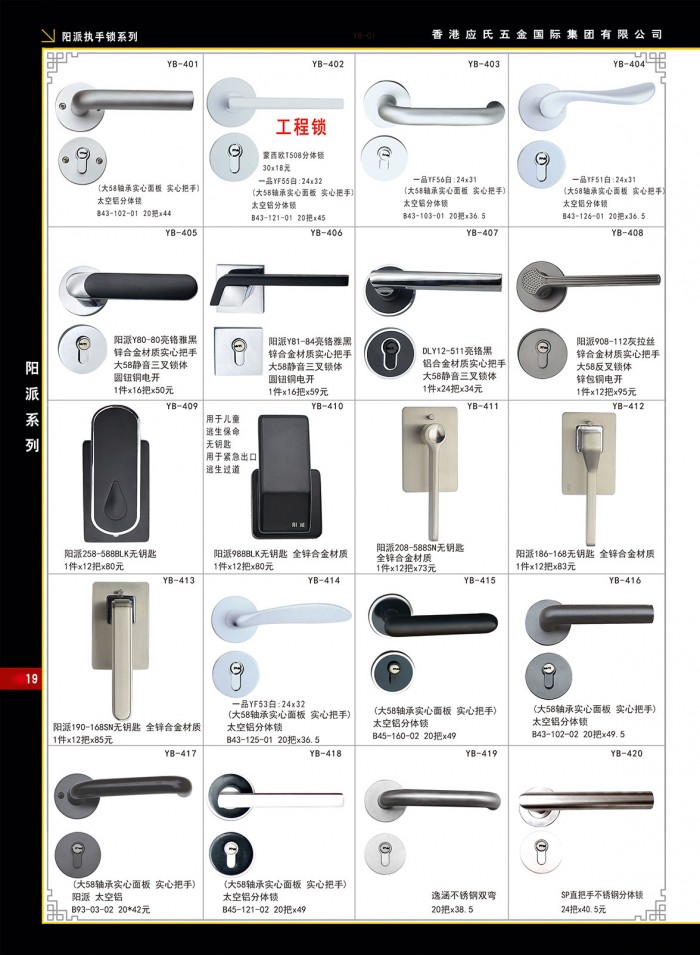 详细信息 阳派执手锁系列-19-应波五金 简介本页是香港应氏五金国际集团有限公司2020年最新彩页 阳派执手锁系列(第十九页) 图片为高清晰图片,请稍等。。。 ![]() |